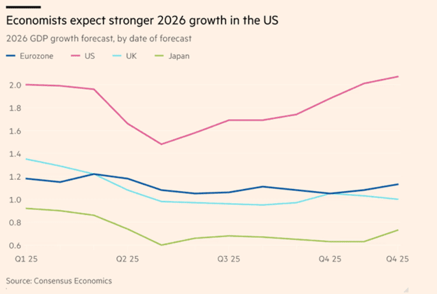 Economists gave their 2026 GDP growth predictions for the U.S., the Eurozone, U.K., and Japan during each quarter of 2025. The U.S is not only the region with the highest expected GDP at over 2%, but it’s the only region with higher expectations in the fourth quarter than the first quarter.