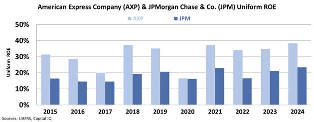 Since 2015, JPMorgan Chase has generated an average return on equity (“ROE”) of 19%. Meanwhile, American Express has delivered an average ROE of 31%.