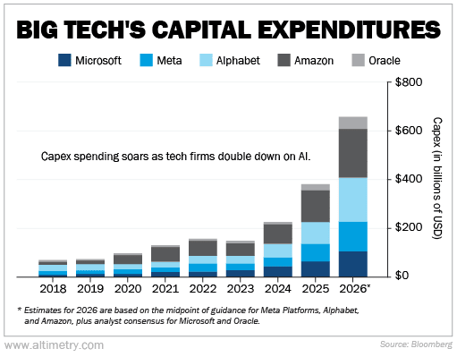 A few weeks ago, Alphabet raised almost $32 billion through bond issuances. And that’s just one week after Oracle borrowed $25 billion. Morgan Stanley expects Big Tech companies to borrow as much as $400 billion throughout the year.