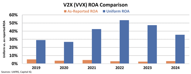 Uniform Accounting reveals V2X has always been more profitable than the market realizes. Uniform ROA was 27% in 2020, above both the company’s cost of capital and the 12% corporate average return.