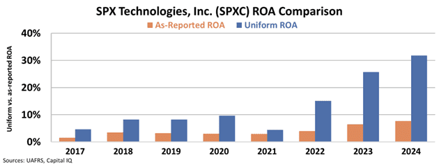 While SPX Technologies’ as-reported return on assets (“ROA”) has grown steadily since 2017, it only delivered 8% returns in 2024, below the 12% corporate average.