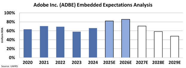 Wall Street analysts expect Adobe’s returns to rise to 86% over the next two years, recognizing the company’s growth opportunity. However, the rest of the market anticipates profitability will drop to 49% by 2029—the lowest level in almost a decade.