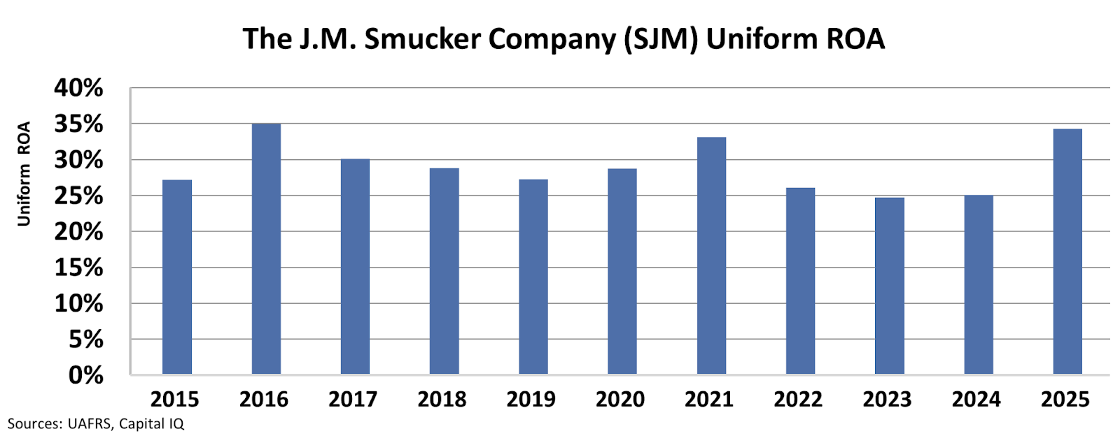 Since 2020, the J.M. Smucker Company’s revenues have averaged $8 billion while maintaining strong returns. The company’s Uniform return on assets (“ROA”) has consistently remained above 20% during this period, reaching 34% this year.