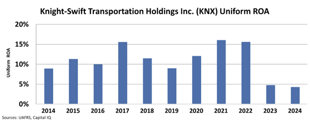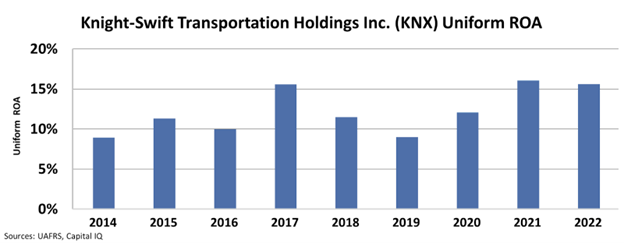 This was a historically strong cycle for the logistics industry, and trucking leader Knight-Swift (KNX) reaped the benefits. The company’s Uniform return on assets (“ROA”) rose to a record 16% in 2021, which it sustained in 2022.