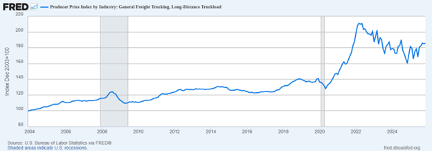 The Producer Price Index for long-distance freight trucking is down from its 211 heights in 2022 to 186 today.