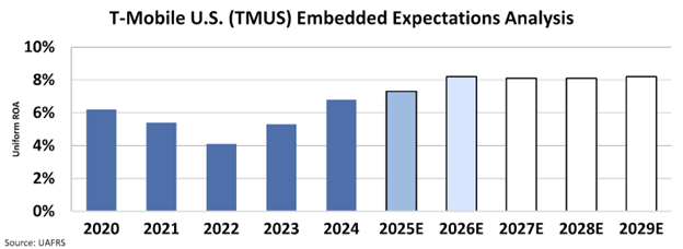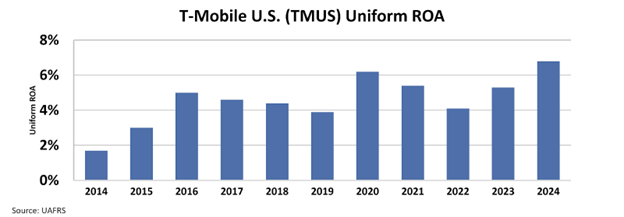 T-Mobile’s Uniform return on assets “ROA” has been mostly around cost of capital levels for nearly two decades, before reaching 7% in 2024, driven by synergies with Sprint and improved operations.