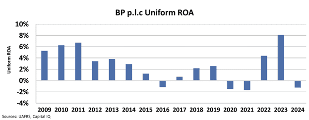 Even though BP saw its returns trend positively in 2022 and 2023, its returns dipped back to negative levels yet again in 2024.