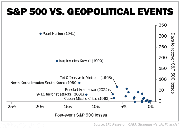 That’s especially true when we look at geopolitical events that occurred nowhere near a recession, such as when the Israel-Hamas war which started in October 2023.