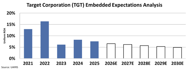 At current valuations, investors expect Target’s Uniform return on assets (“ROA”) to go down from 7.6% this year to just 5% by 2030.