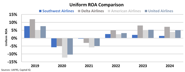 Southwest’s Uniform return on assets (“ROA”) declined from 7% in 2019 to -5.7% in 2020. While returns turned positive in 2022 at 2.6%, the company’s returns dropped to 1.4% by 2024.