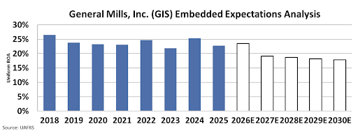 By 2030, the market expects General Mills’ Uniform ROA to decline to 18%, falling below the 20% returns it has delivered since 2018.