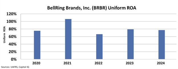 BellRing’s returns have likewise reflected the steady growth. Since 2020, the company’s Uniform return on assets (“ROA”) has averaged more than 75%. And last year, the company generated a Uniform ROA of 77% to go along with a 32% Uniform asset growth.