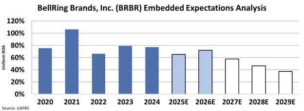 At its current stock price, Wall Street analysts forecast that BellRing’s returns will hover around 70% in the next two years. However, the rest of the market expects Uniform ROA to nosedive to 37% by 2029.