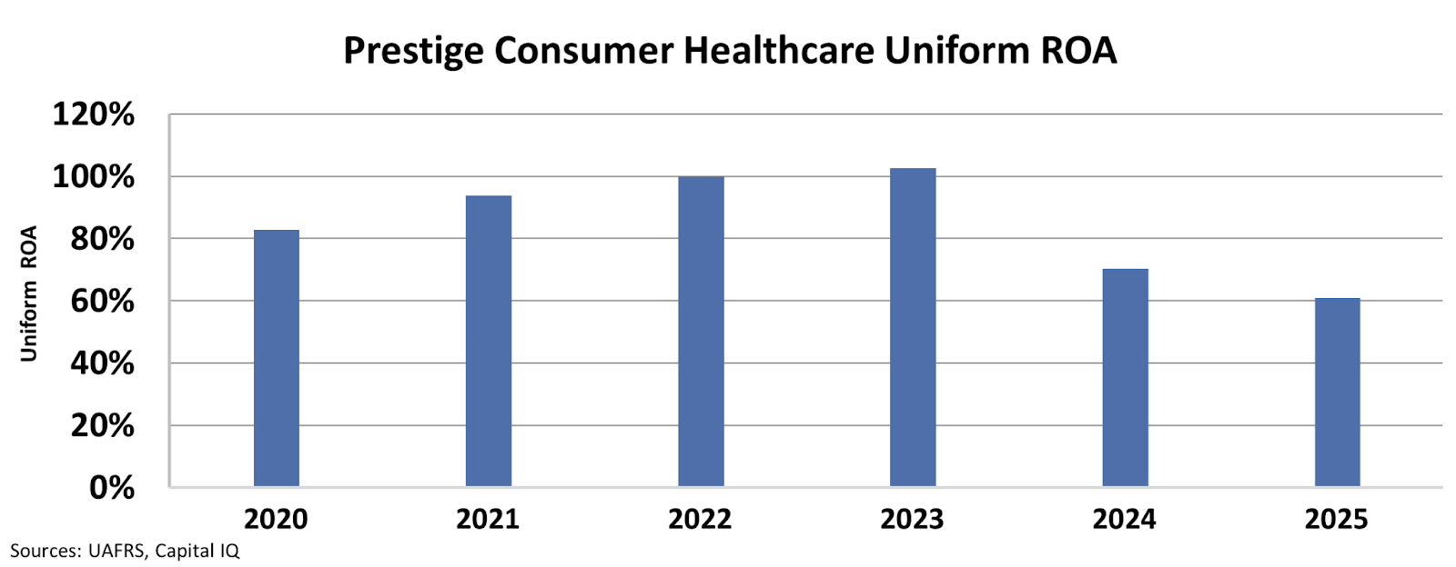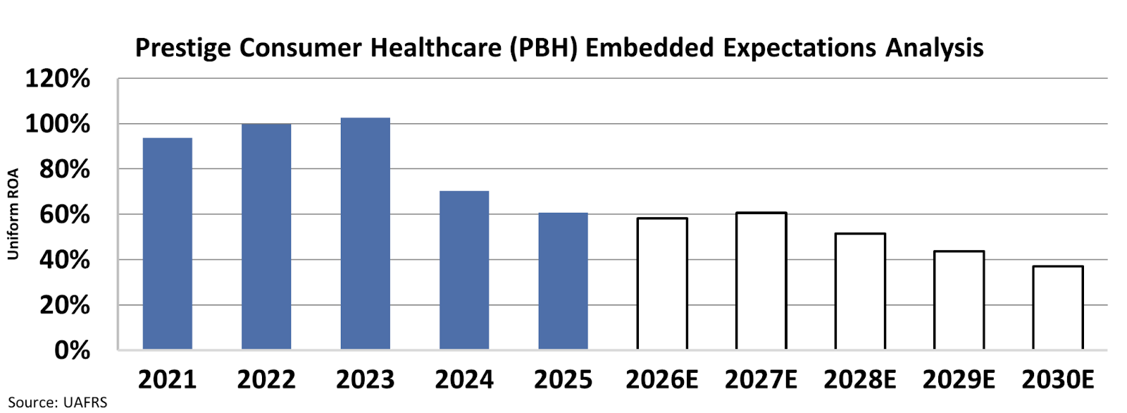 At its current stock price, the market expects Prestige’s Uniform ROA to decline to 37% by 2030.
