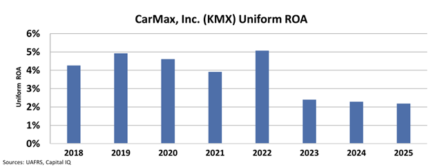 From 2018 to 2022, CarMax’s Uniform return on assets (“ROA”) hovered between 4% to 5%. But since 2023, returns have collapsed to 2% and have remained flat since.